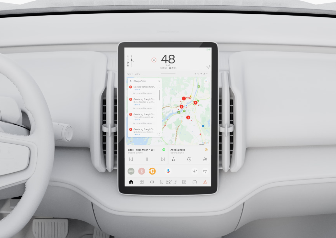 Bei niedrigem Akkustand schlägt Ihnen das Fahrzeug automatisch nahegelegene Ladestationen vor und zeigt diese übersichtlich auf Google Maps an. Die Navigation führt Sie direkt zur gewählten Station, inklusive Ankunftszeit und prognostiziertem Ladestand. So behalten Sie unterwegs stets die Kontrolle über Reichweite und Ladebedarf.